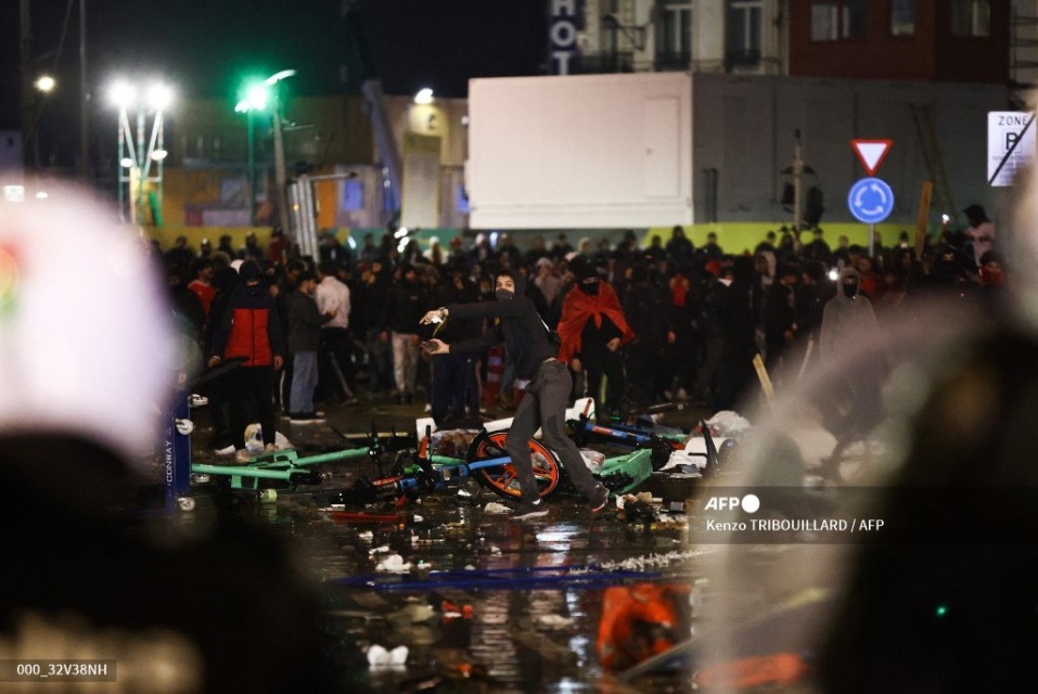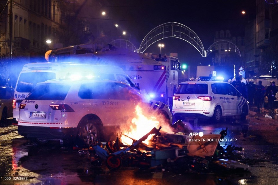 Police cars drive past burning eletrical scooters on the sideline of the live broadcast of the Qatar 2022 World Cup Group F football match between Belgium and Morocco, in Brussels, on November 27, 2022. – Violence broke out in Brussels on November 27, 2022 after Morocco’s victory over Belgium at the World Cup, with “dozens of people” attacking street furniture and police, police said. (Photo by Kenzo TRIBOUILLARD / AFP)