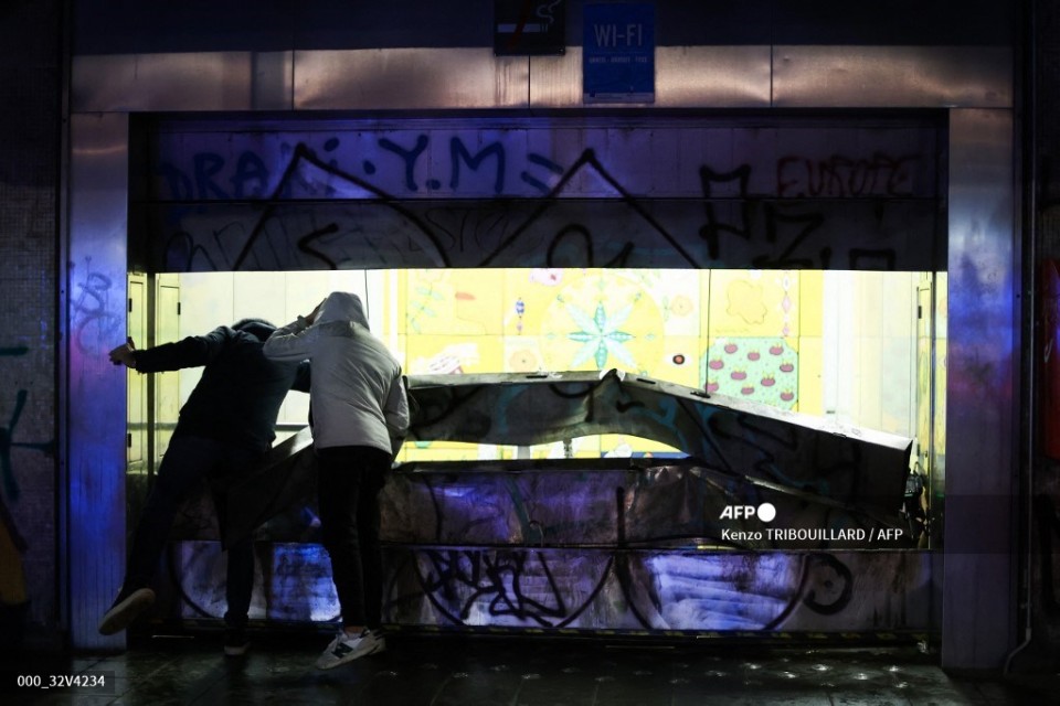People stand in front of a partially destroyed subway station entrance on the sideline of the live broadcast of the Qatar 2022 World Cup Group F football match between Belgium and Morocco, in Brussels, on November 27, 2022. – Violence broke out in Brussels on November 27, 2022 after Morocco’s victory over Belgium at the World Cup, with “dozens of people” attacking street furniture and police, police said. (Photo by Kenzo TRIBOUILLARD / AFP)