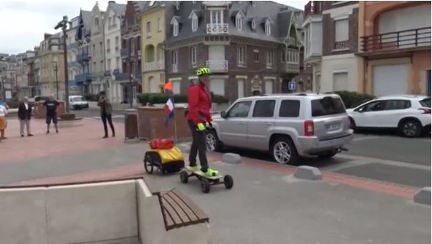 His skateboard has a big battery attached to its underside and he carries a solar panel in his trailer in order to charge.