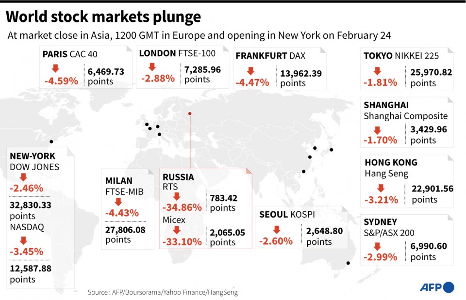 In reaction, oil rocketed more than eight percent, with European benchmark Brent prices briefly cruising past $105 per barrel for the first time since 2014, while aluminium and wheat surged to record peaks on fears over output from major exporter Russia.