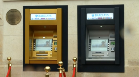 Barclays transformed the ATM at its Enfield branch into gold, added a commemorative plaque, and placed a red carpet in front for its users. From Reuters video file.