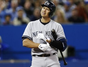 New York Yankees Alex Rodriguez reacts during an at bat against the Toronto Blue Jays during the fifth inning of their MLB American League baseball game in Toronto, September 17, 2013. REUTERS/Mark Blinch