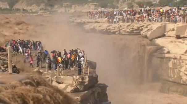 The waterfall, which is located on the border of Shaanxi and Shanxi provinces, has been greatly swollen by monsoon rains during the Golden Week, attracting throngs of holidaymakers from across China to visit.