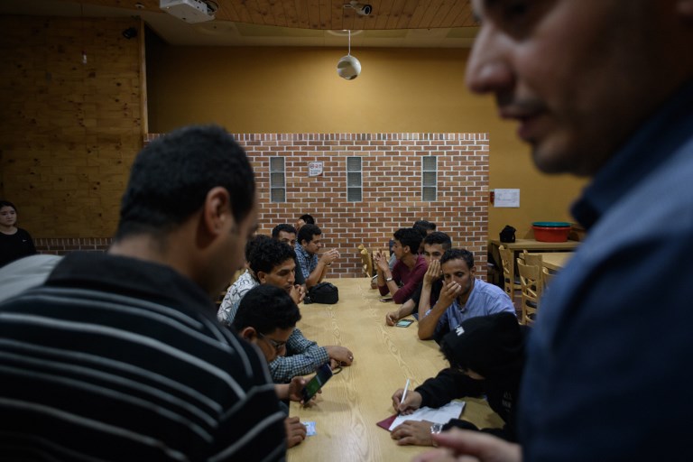 Packed four to a room to save money, they take turns to cook traditional Yemeni meals in a basement communal area.